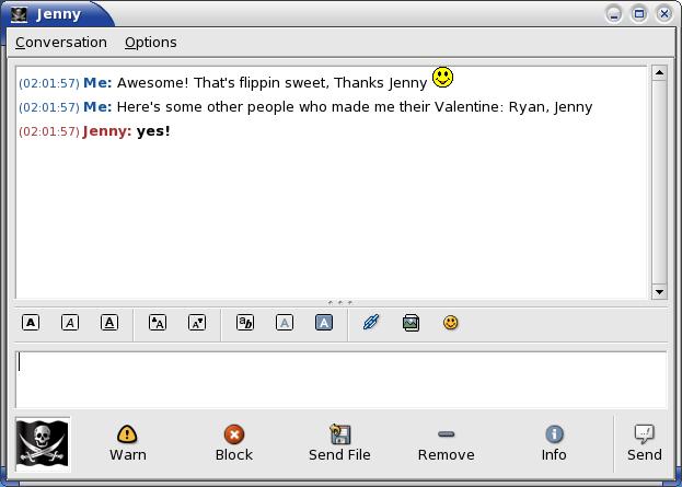 I also spent WAY too much time writing this Gaim script for AIM that keeps track of people who want to be my Valentine or not. Incredibly cheesy... yes. But it's sorta cool, and people so far have gotten a kick out of it. It takes a "Yes!" or "No!" answer and displays the aliased name with a message. Pretty neat no?