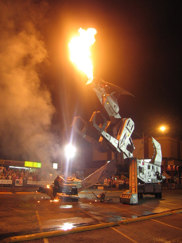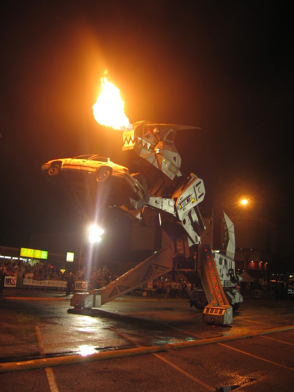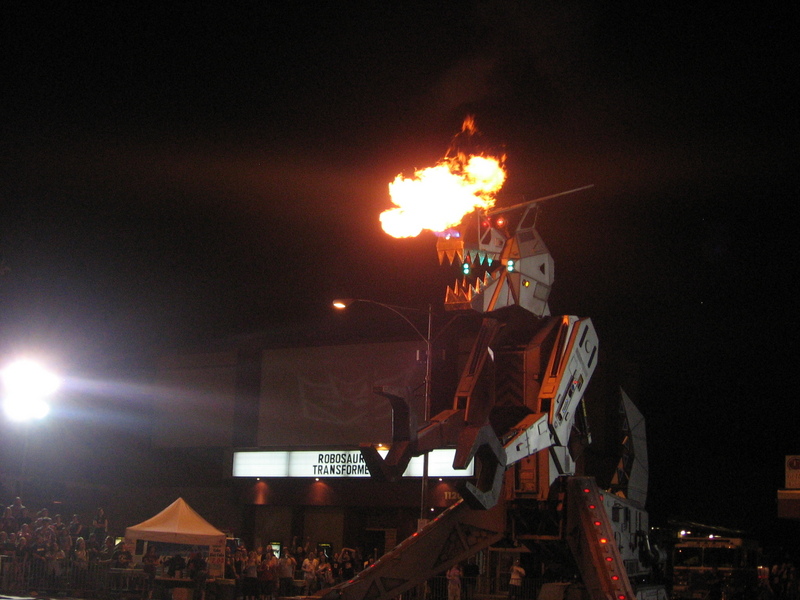 Two weeks ago Transformers was released, and because the Alamo Drafthouse is pretty much the greatest movie theater in the history of the world, they decided that just showing Transformers wasn't enough. No no, they felt that the only way to truly appreciate a movie about giant robot cars crushing each other was by having a giant robot crushing cars in their parking lot. So they brought Robosaurus to Austin for the opening night of the Transformers movie. Needless to say it was all kinds of incredible: