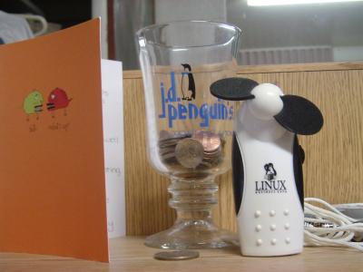 There's a glass cup my best friend gave me with a penguin on it that I keep my spare change in. It's cool. I wonder how much