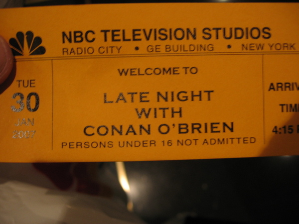 My ticket to go see Conan! I ended up getting to hug him and have him claim that "I feel there is some unresolved sexual tension between us"