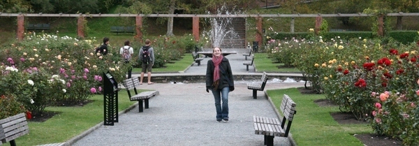 Kara walking through the rose garden