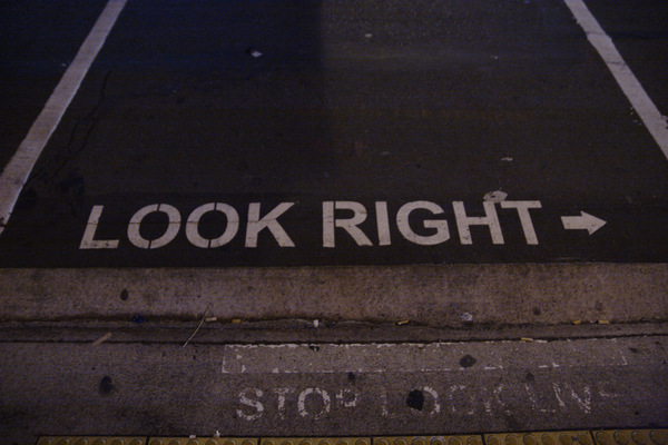 Reminding tourists not to get run over by cars driving on the left side of the road