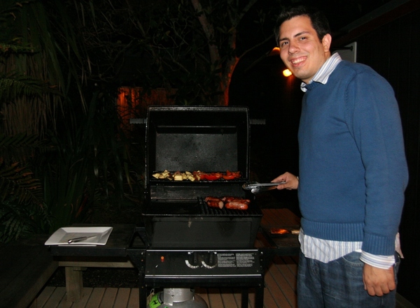 Cooking up some red peppers, tomatoes, and sausages