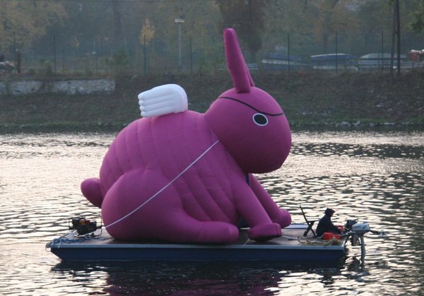 A giant purple bunny floating along the Vltava river. No idea why it was there, it was just floating right along